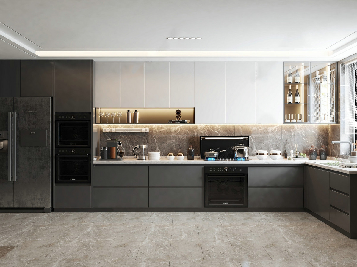 简约优雅的厨房,有情怀也有腔调!开放式厨房,简约质感,再加些许精致浪漫。设计中我们运用开放式手法并在局部做出玻璃柜门,放大居住空间;通过深色简约色彩的搭配,奠定
